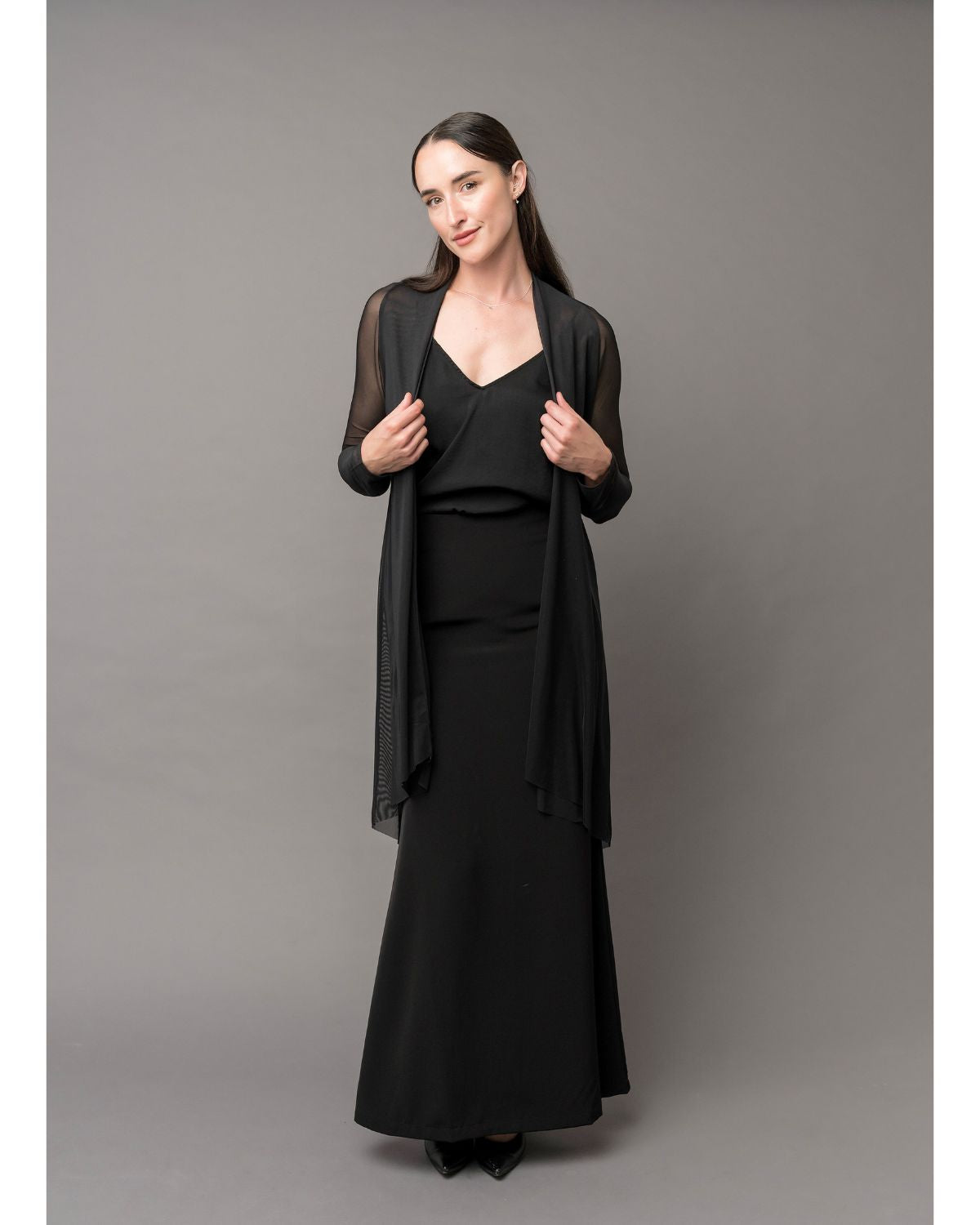 Made from a soft, breathable knit with double layers from mid-back to hem, this piece combines elegance and comfort in one modern silhouette. The 42" length offers full coverage and easy movement, making it ideal for concert black attire, formal performances, or everyday layering.