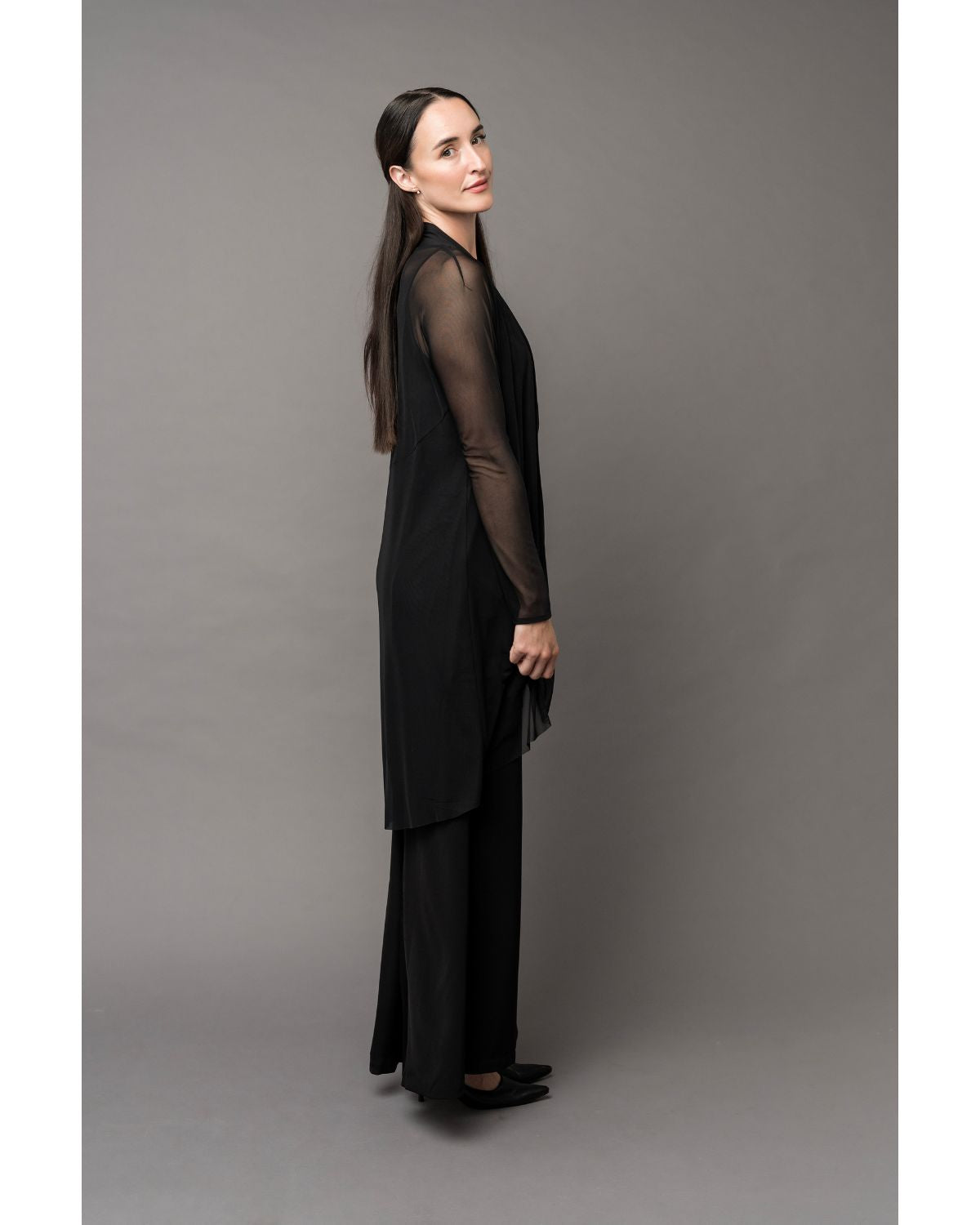 Cue the dramatic entrance. This black duster cardigan is the definition of effortless drama—long, sleek, and unapologetically extra. Designed with sheer mesh sleeves and a semi-sheer upper back, it adds just the right amount of edge while keeping you fully covered where it matters.