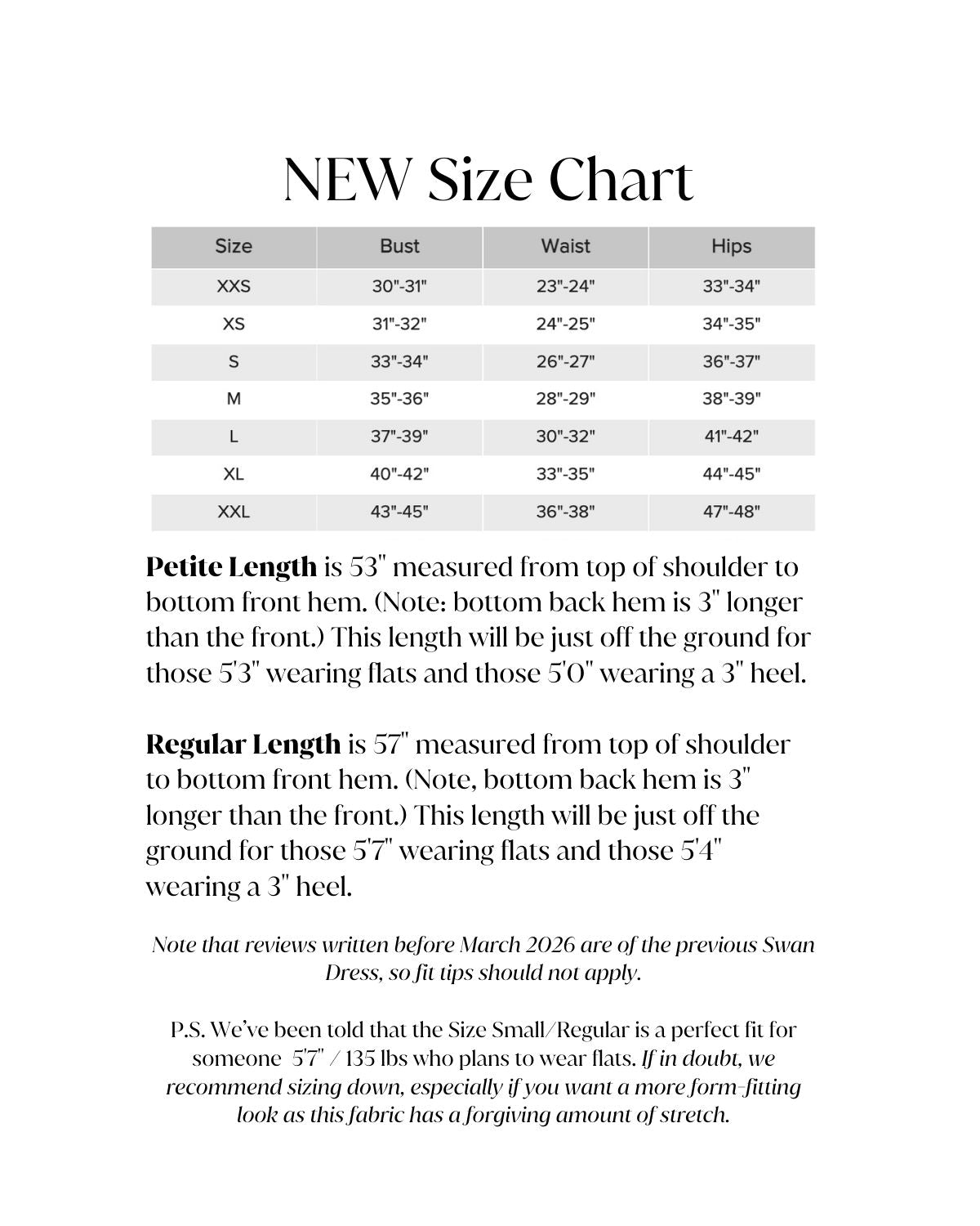 Note that reviews written before March 2026 are of the previous Swan Dress, so fit tips should not apply.